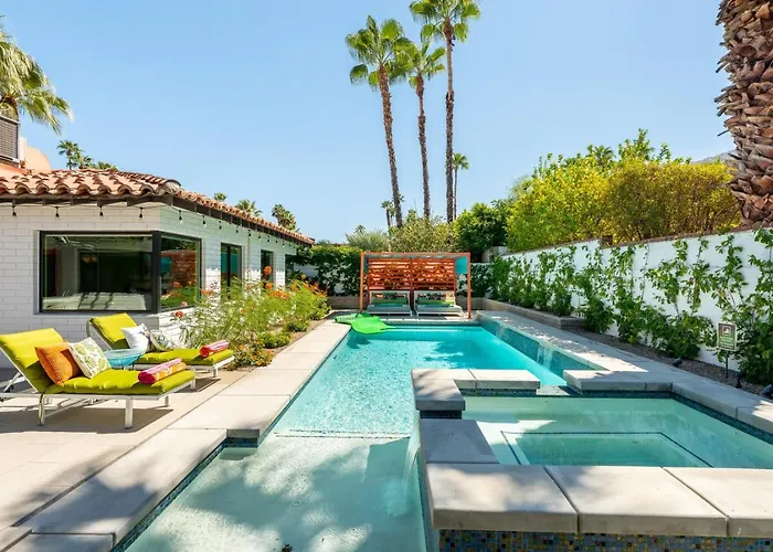 Casa Colibri | Tennis Club Elegance With Pool, Spa & Mountain Views offers self-catering amenities, such as an equipped kitchen, and a dining area for guests' convenience. The kitchen also offers a refrigerator, an oven, and kitchenware. Crepes de Paris is located only 8 minutes' walk from the Palm Springs property and offers a wide choice of Central European dishes. Well-connected to many sights, the Palm Springs accommodation is within reach of Calle Encilia at Arenas bus station.